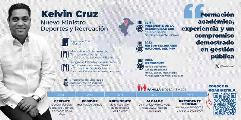 El presidente Luis Abinader anunció este jueves el nombramiento de Kelvin Cruz como el nuevo ministro de Deportes, en reconocimiento a su amplia experiencia tanto en la gestión deportiva como en la administración pública.