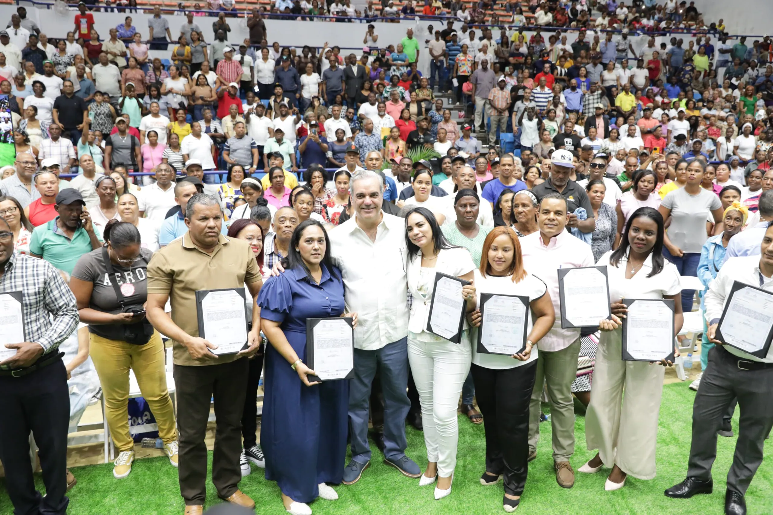 El presidente Luis Abinader encabezó este domingo la entrega de 1,600 títulos de propiedad de un total de 2,521, beneficiando de manera directa a más de 10,100 personas de los barrios San Carlos, Villa San Carlos y George, de esta provincia, en un acto que marca un paso firme hacia el fortalecimiento de la seguridad jurídica y la inclusión social en el país.