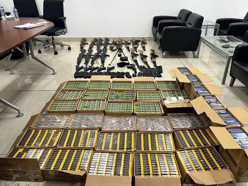 Dentro del hallazgo se encontraron 30 fusiles de distintos calibres, 6 pistolas Glock, modelo Gen 5, calibre 9 milímetros y una pistola Smith & Wesson, modelo SD9 VE, calibre 9 milímetros, además de 37 cargadores para fusiles.