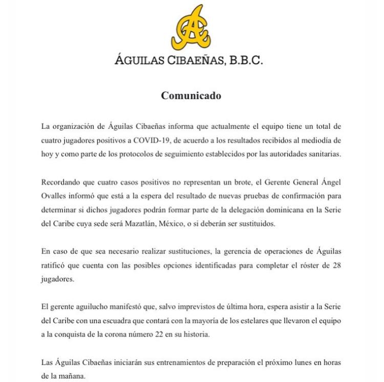 La organización de Águilas Cibaeñas informó este domingo mediante un comunicado que actualmente el equipo tiene un total de cuatro jugadores positivos a Covid-19, de acuerdo a los resultados recibidos al mediodía de hoy.