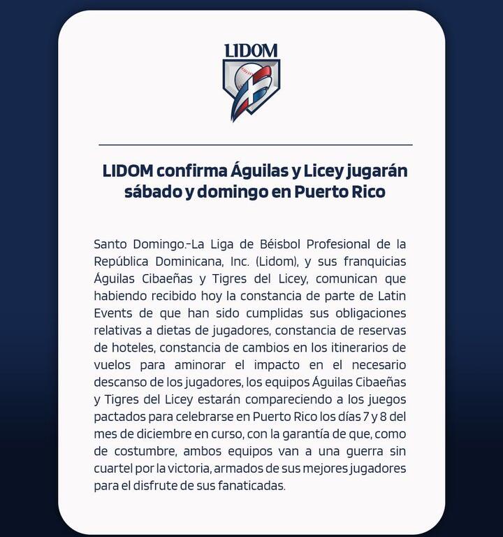 La Liga de Béisbol Profesional de la República Dominicana, Inc. (LIDOM), y sus franquicias Águilas Cibaeñas y Tigres del Licey, comunican que recibieron este viernes la constancia de parte de Latin Events del cumplimiento de obligaciones relativas a dietas de jugadores, reservas de hoteles y de cambios en los itinerarios de vuelos para aminorar el impacto en el necesario descanso de los jugadores.