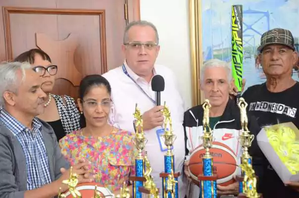 Entre los artículos entregados se incluyen copas, trofeos, medallas, balones de baloncesto, voleibol, fútbol y béisbol, así como mallas de voleibol, bates de béisbol y softbol, aros, guantes y otros accesorios.