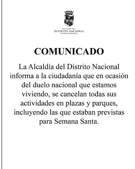 La Alcaldía del Distrito Nacional informó este jueves que canceló todas las actividades que tenía en agenda en plazas y parques, como parte de las medidas adoptadas por el duelo que atraviesa el país.