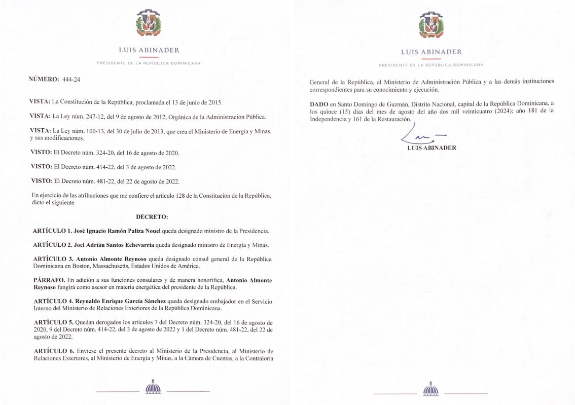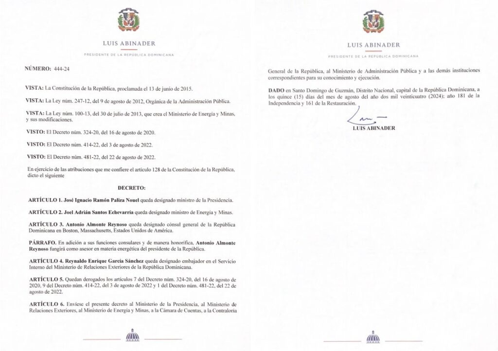 Mediante decreto 444-24 queda designado Antonio Almonte Reynoso cónsul general de la RD en Boston, Massachusetts, Estados Unidos de América. En adición a sus funciones consulares y de manera honorífica, fungirá como asesor en materia energética del presidente de la República.