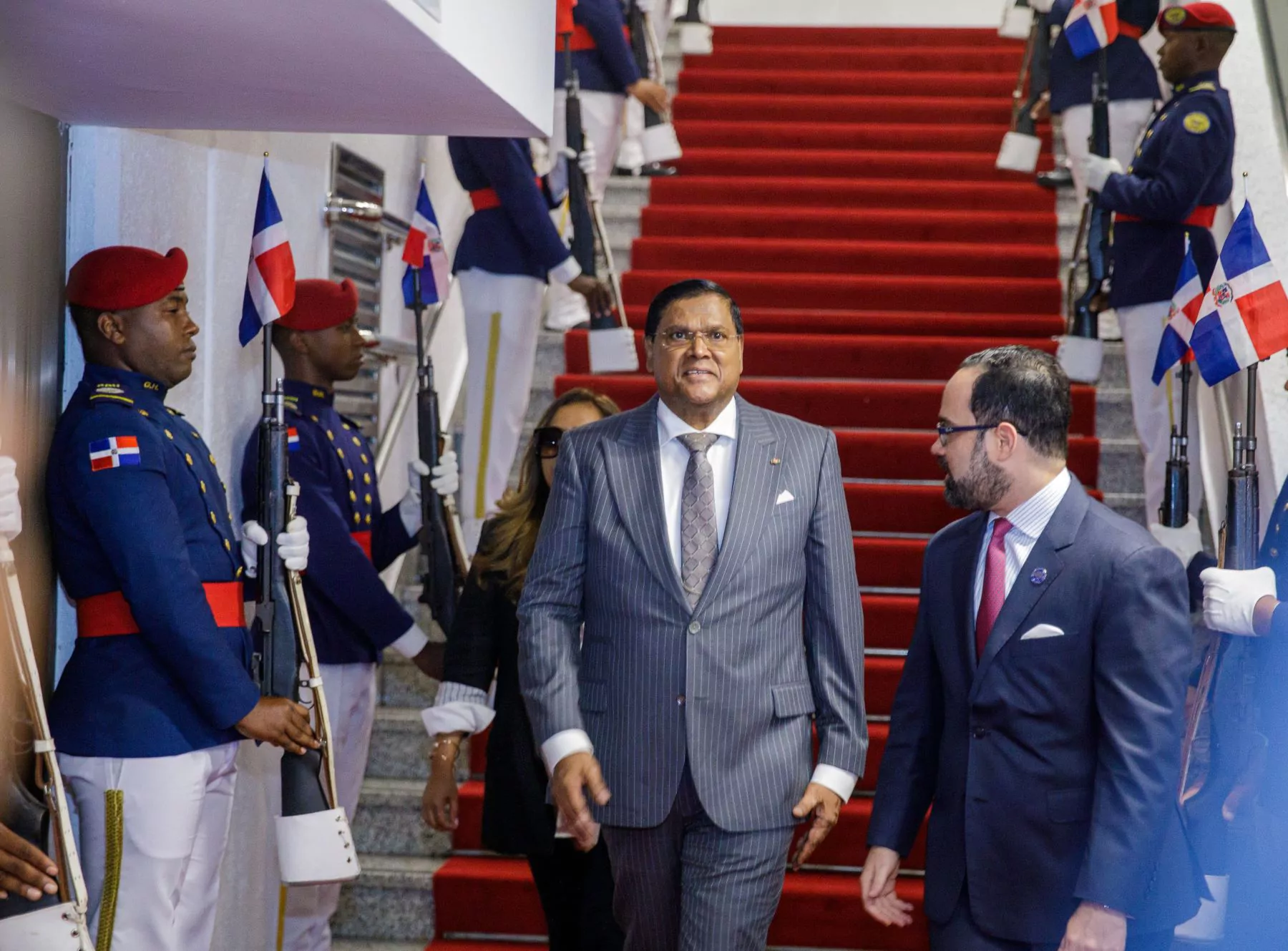 Santokhi llegó a suelo dominicano a las 7:03 de la noche por el Aeropuerto Internacional de las Américas José Francisco Peña Gómez, junto a su esposa Melissa Santokhi, el canciller de Suriname, Albert R. Ramdin y una delegación para asistir al acto el próximo 16 de agosto.