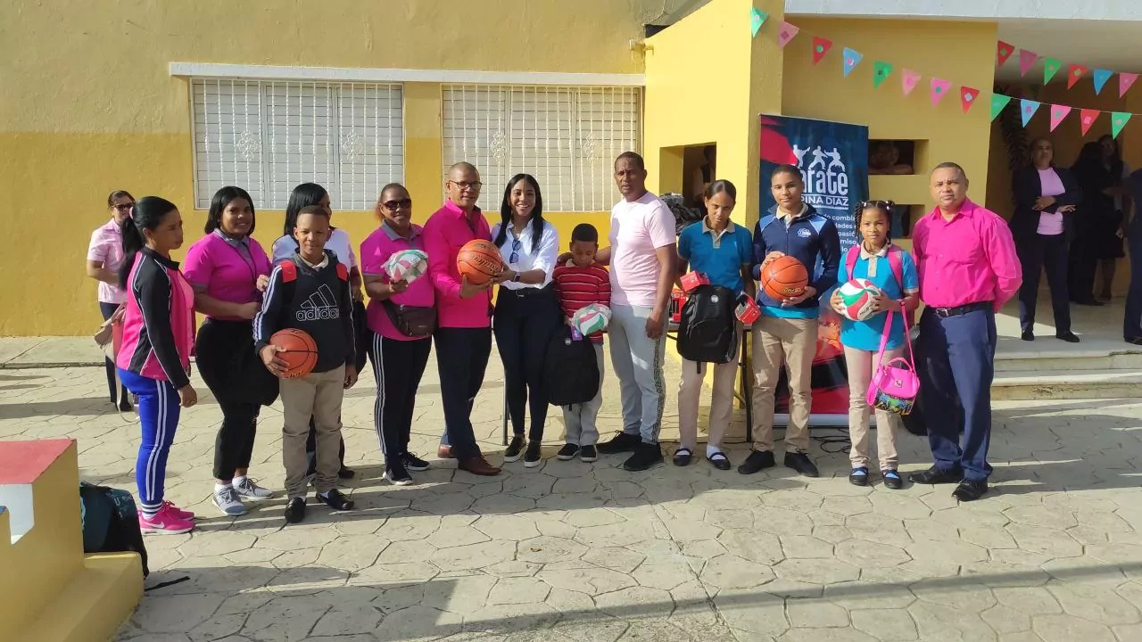 La atleta de origen sanjuanero, Karina Díaz, entregó este martes utilería deportiva y útiles escolares a la escuela Mercedes Consuelo Matos, centro donde realizó sus estudios primarios.