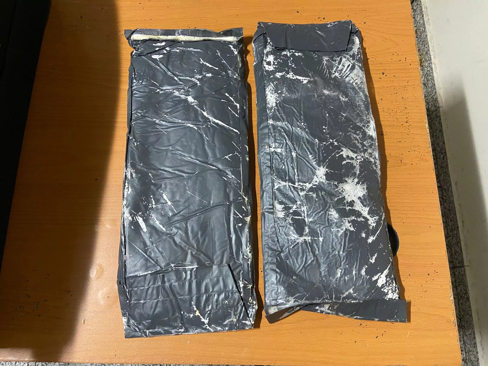 Tras iniciar un proceso de inspección más riguroso y en presencia de un fiscal adjunto, se descubrió un doble fondo en el interior de la maleta, donde se ocuparon dos láminas presumiblemente cocaína, con un peso aproximado de 1.8 kilogramos.