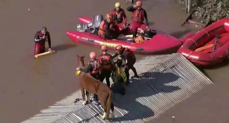 Los socorristas voluntarios en Rio Grande do Sul, Brasil, están enfrentando el desafío de rescatar tanto a personas como a animales atrapados por las inundaciones. Un caballo llamado «Caramelo», que estuvo sobre el techo de una construcción anegada, se volvió viral tras su rescate.