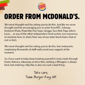 Burger King pide a sus clientes apoyar a la competencia debido a la pandemia
