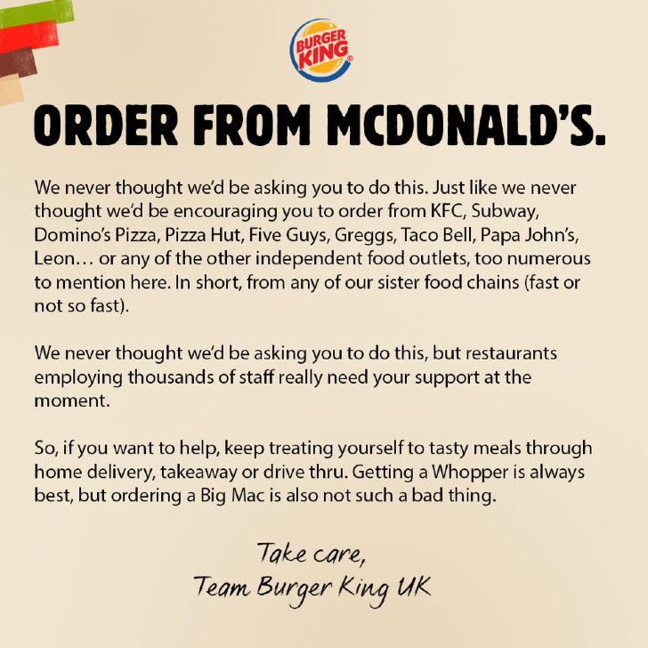 “Nunca pensamos que estaríamos pidiéndoles a ustedes que hagan esto”. Con esa advertencia Burger King hizo lo impensado: recomendar a sus clientes que compren en McDonald’s. Y lo dicen con letras bien grandes: “Ordena en McDonald’s”.