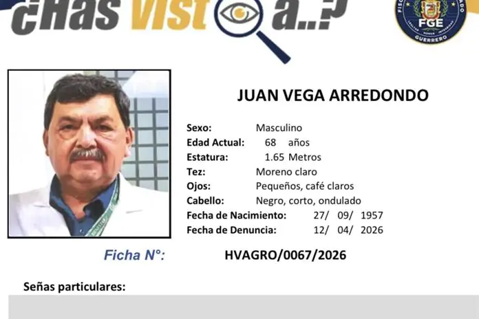 El médico Juan Vega Arredondo, director del Hospital General Adolfo Prieto del municipio mexicano Taxco y padre del alcalde de esa misma demarcación, Juan Andrés Vega Carranza, fue reportado como desaparecido, lo que activó un operativo de búsqueda por parte de autoridades en el estado de Guerrero.