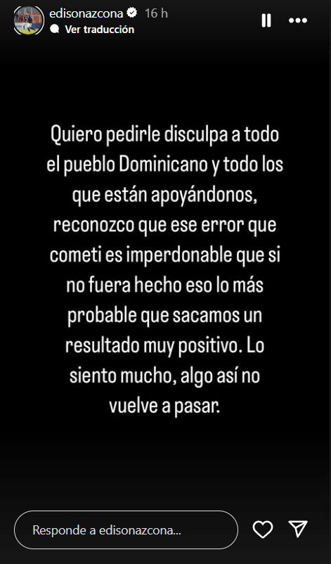 A través de su cuenta de la red X, Azcona pidió «disculpa a todo el pueblo dominicano y a todos los que están apoyándonos», reconoció que el «error» que cometió «es imperdonable» y consideró que si no lo hubiera hecho «lo más probable» es que el resultado fuera diferente.