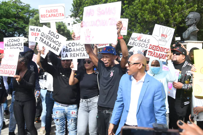 La Asociación de Centros Nocturnos Unidos marchó pacíficamente la mañana de este lunes en las inmediaciones del Ministerio de Interior y Policía, en protesta por el cierre de centros de expendio de bebidas alcohólicas y la incautación de bocinas.