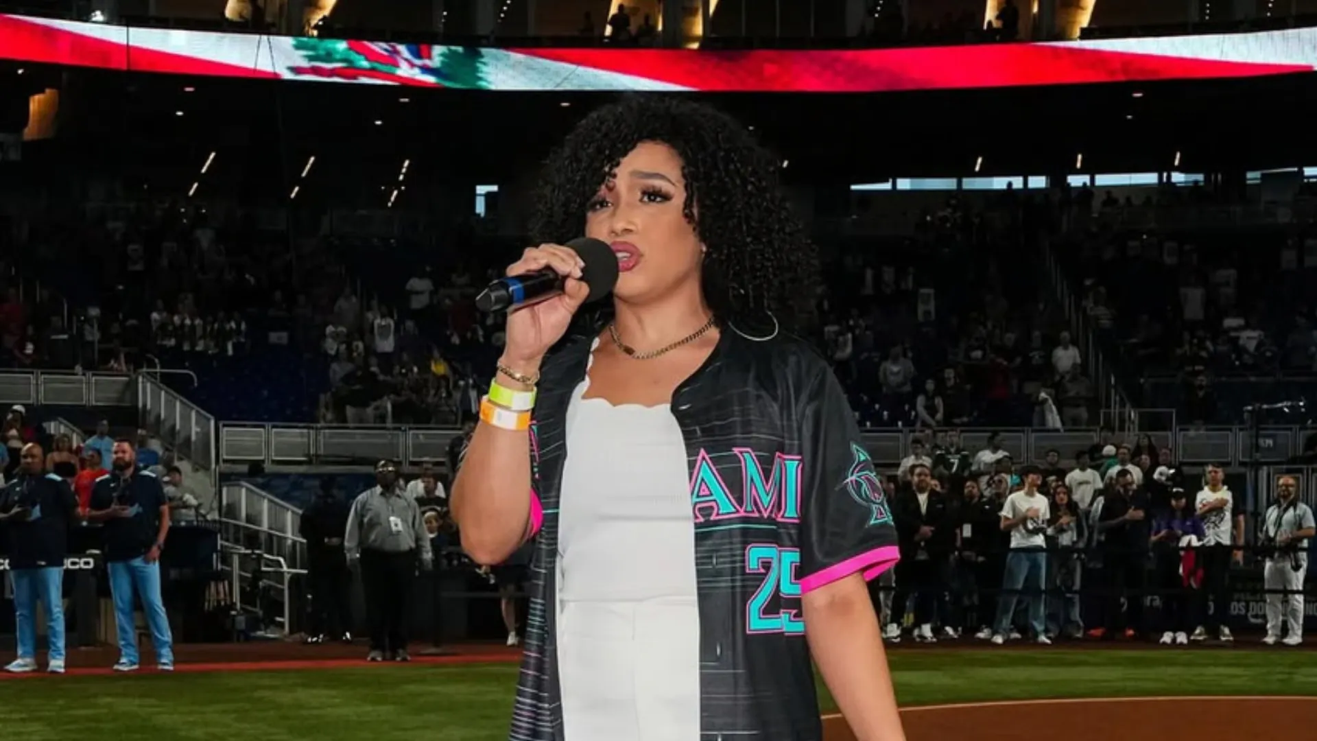 La cantante y actriz Chelsy Bautista interpretó con gran emotividad las gloriosas notas del Himno Nacional de la República Dominicana durante el evento “La Herencia Dominicana”, celebrado en el LoanDepot Park, estadio de los Marlins en Miami.