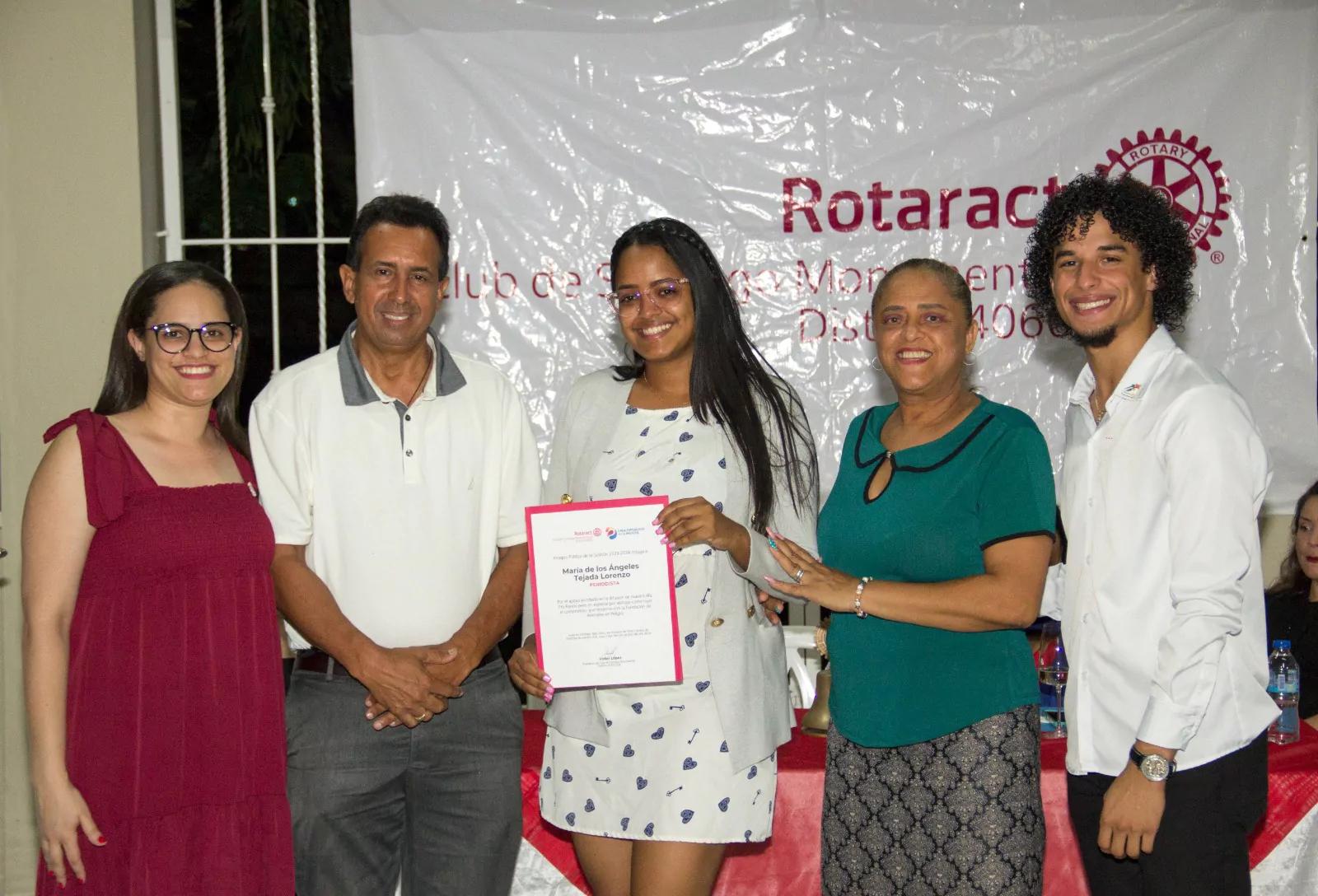 Durante su cambio de directiva #47, el Club Rotaract de Santiago Monumental reconoció a la periodista de Teleuniverso María Tejada Lorenzo por el apoyo brindado en la difusión de la rifa Pro Fondo pero en especial por abrazar como suyo el compromiso que tiene esta institución con la Fundación de Animales en Peligro.