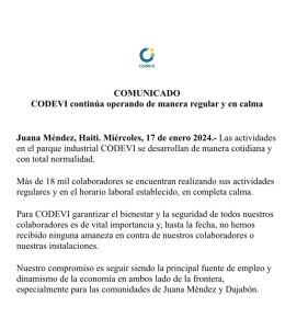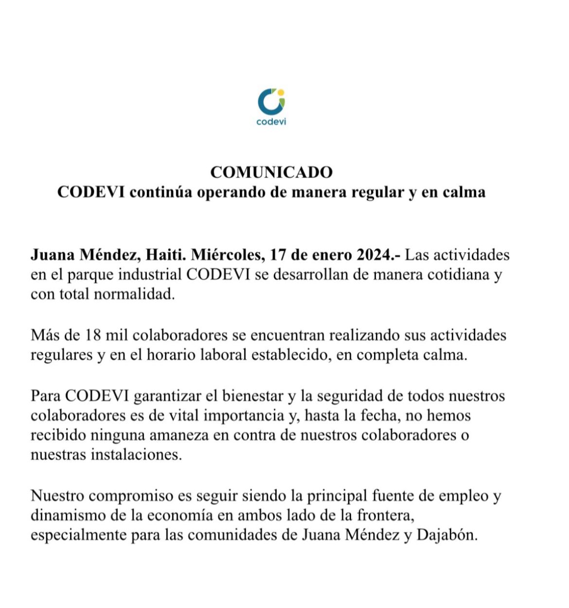 La compañía Compagne Development Industriel (CODEVI) aseguró este miércoles que sus actividades continúan desarrollándose de manera cotidiana y con total normalidad, a pesar de las amenazas realizadas por simpatizantes del exlíder rebelde Guy Philippe, de que cerrarían la zona franca si los ejecutivos y trabajadores no se unen a las manifestaciones que han paralizado algunas ciudades de Haití en contra del Gobierno del primer ministro Ariel Henry.