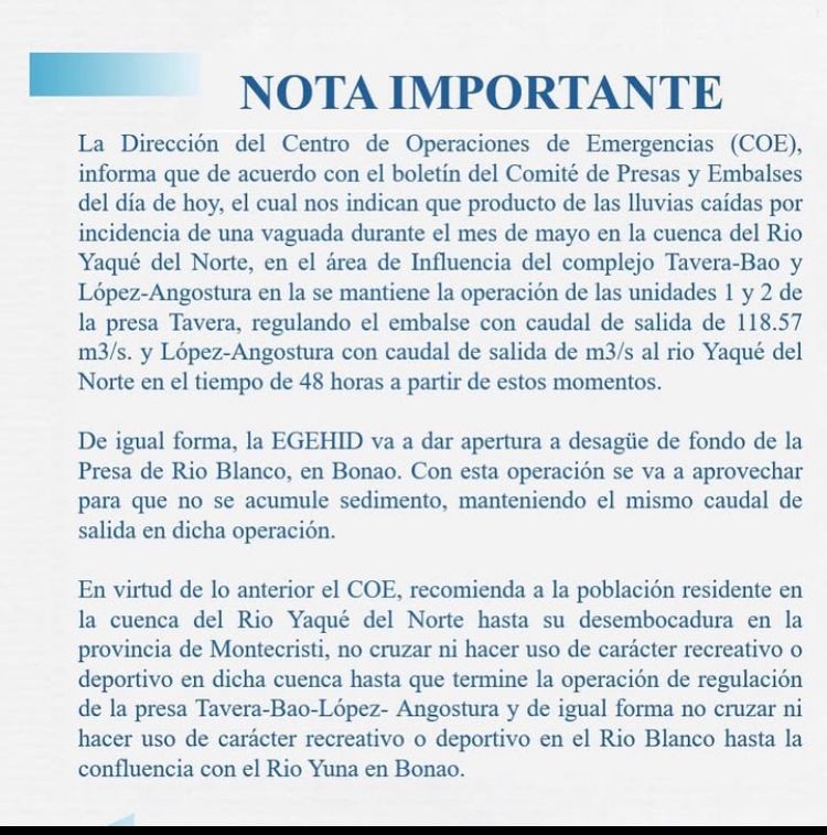 El Centro de Operaciones de Emergencias (COE) informó que, debido a las lluvias registradas durante el mes de mayo por la incidencia de una vaguada en la cuenca del río Yaque del Norte, continúan las operaciones de regulación de las presas Tavera, Bao y López-Angostura, lo cual ha provocado un incremento en el caudal de salida de agua hacia ese afluente.