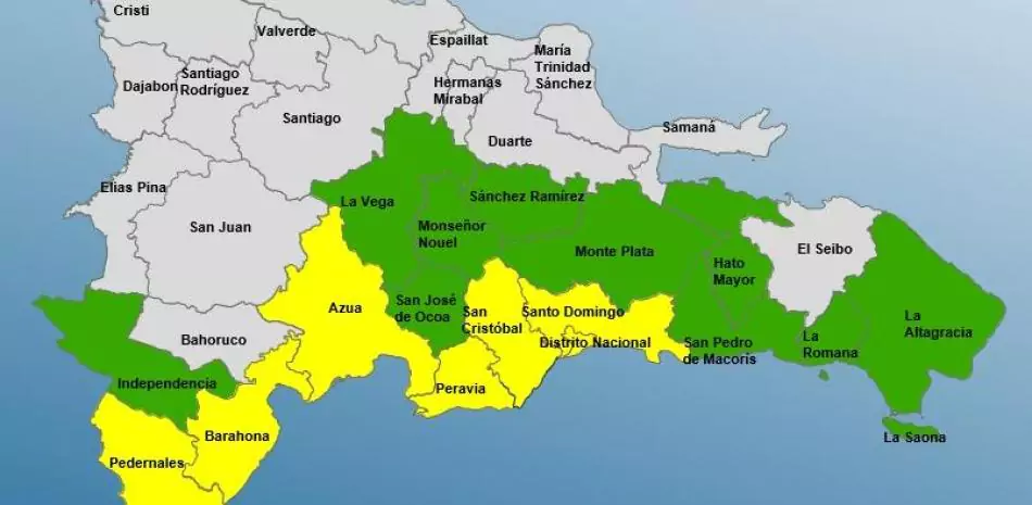 Mientras que en alerta verde están: La Vega, La Romana, San José de Ocoa, San Pedro de Macorís, La Altagracia, Hato Mayor, Monte Plata, Monseñor Nouel, Independencia y Sánchez Ramírez.