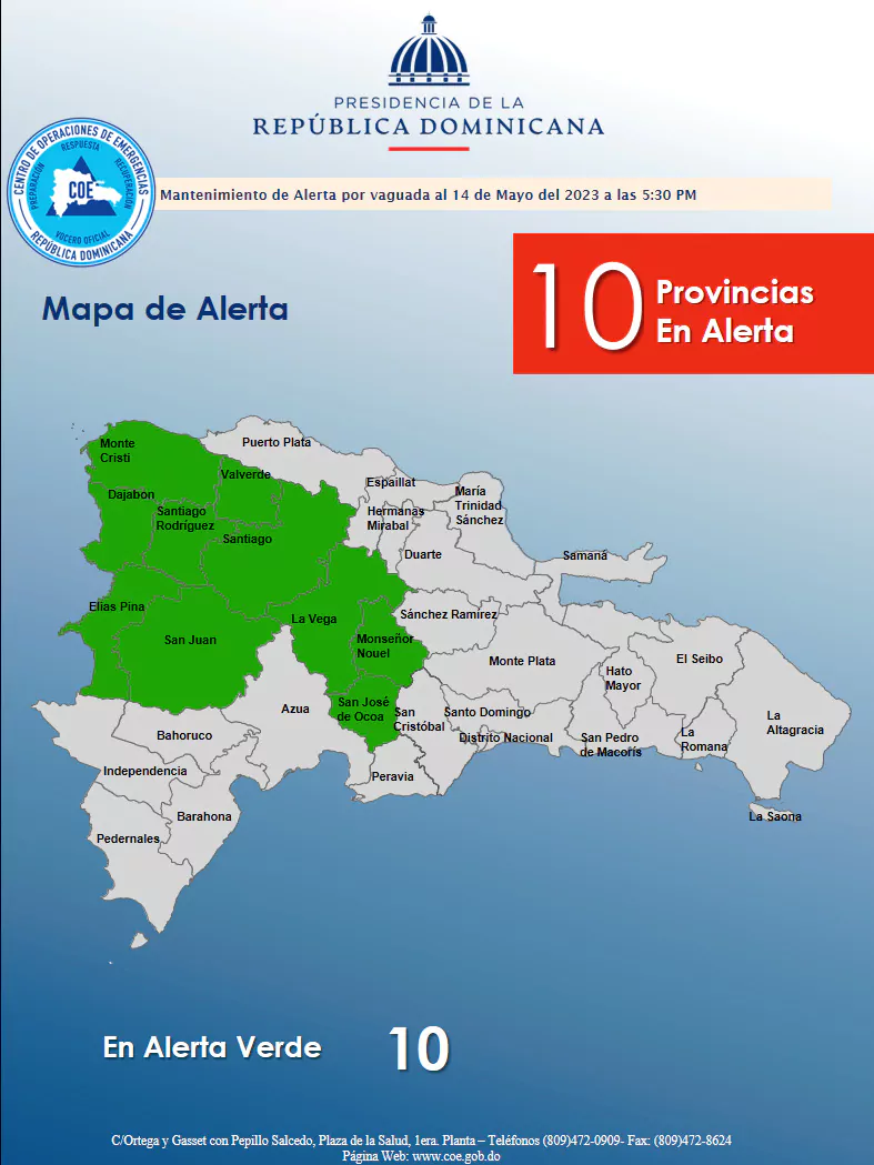 La información fue dada a conocer por el director del COE, José Manuel Méndez, quien indicó que las provincias en alerta verde son: Santiago Rodríguez, Valverde, Santiago, Monseñor Nouel, Monte Cristi, La Vega, Elías Piña, San José de Ocoa y San Juan y que están en “alto riesgo”.