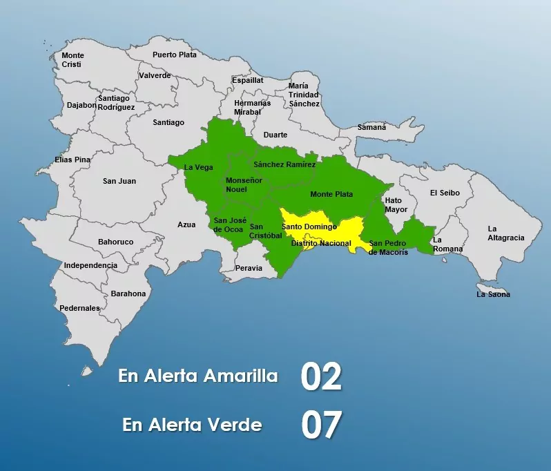 Las provincias en alerta amarilla son: Santo Domingo y Distrito Nacional. Mientras que en verde están: Monte Plata, La Vega, San Pedro de Macorís, Sánchez Ramírez, San Cristóbal, Monseñor Nouel y San José de Ocoa.