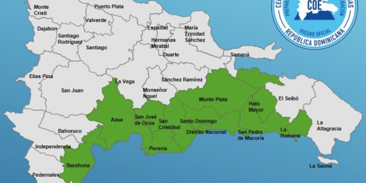 Las provincias en alerta verde son: Barahona, Azúa, San José de Ocoa, San Cristobal, Peravia, Santo Domingo, Distrito Nacional, Monte Plata, Hato Mayor, San Pedro y la Romana.