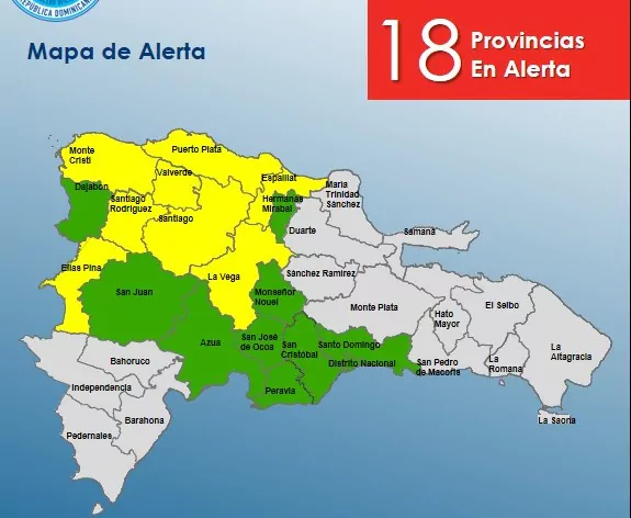 Las provincias en alerta amarilla son: Monte Cristi, Santiago Rodríguez, Santiago, Valverde, Elías Piña, Espaillat, Puerto Plata y La Vega.