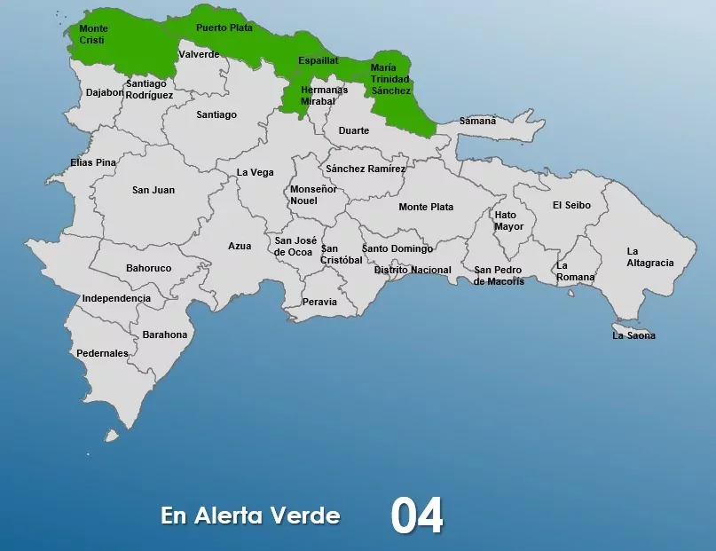 Las provincias que se encuentran en alerta verde son: María Trinidad Sánchez, Espaillat, Puerto Plata y Montecristi.