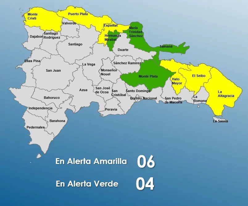 Mientras que en alerta verde estan: Monte Plata, Hermanas Mirabal, María Trinidad Sánchez y Samaná.