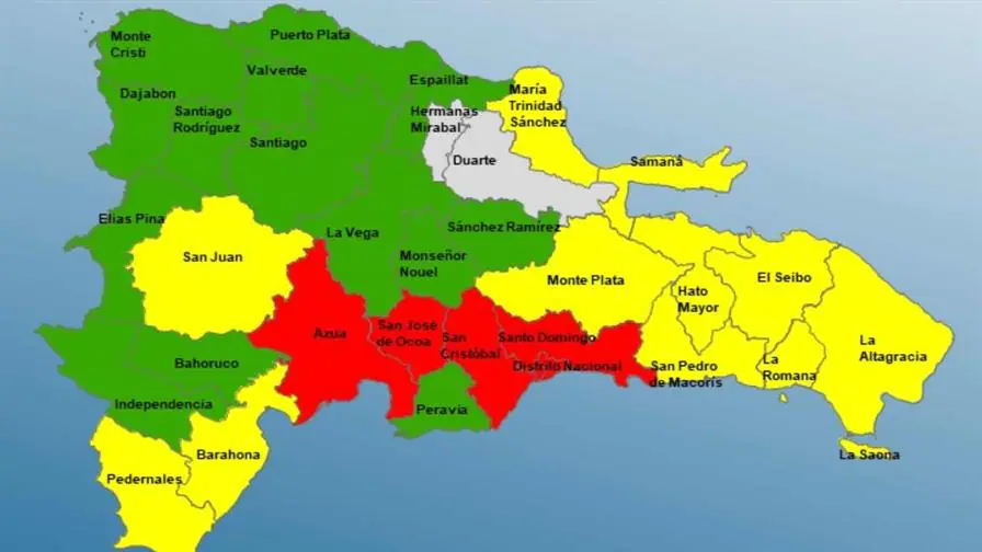 En tanto, el organismo mantiene en alerta roja el Distrito Nacional, Santo Domingo, San José de Ocoa, San Cristóbal y Azua.