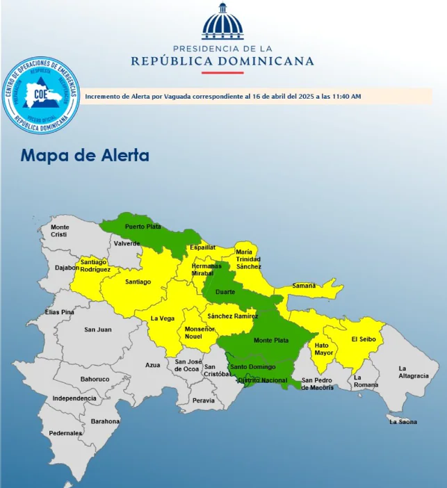 El Centro de Operaciones de Emergencias (COE) mantiene 11 provincias en alerta amarilla y 5 en verde ante el pronóstico de lluvias moderadas a fuertes, tormentas eléctricas y ráfagas de viento, según informó el Instituto Dominicano de Meteorología (Indomet).
