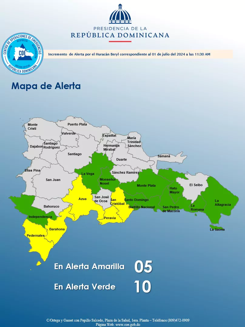 La Dirección del Centro de Operaciones de Emergencias (COE), informa que de acuerdo al boletín meteorológico del día de hoy, de la Oficina Nacional de Meteorología “ONAMET, el cual establece que BERYL huracán Categoría 4, se localiza en la latitud 12.4 norte y longitud 61.3 oeste, esto es, a unos 25 kilómetros al este/sureste de Carriacou, Antillas Menores. Tiene vientos máximos sostenidos de 220 kph y se desplaza hacia el oeste/noroeste a unos 31 kph. Es importante mantenerse atentos a la evolución y desarrollo de BERYL a través de los boletines emitidos por este Centro Nacional de Pronósticos.
