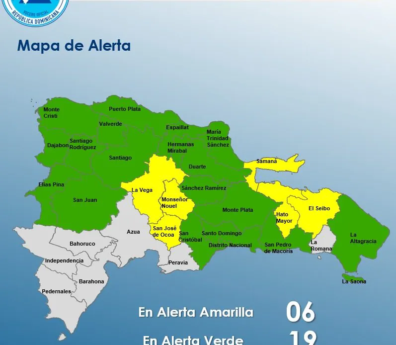 Mientras que las provincias en alerta verde son: Sánchez Ramírez, Puerto Plata, Valverde, Santiago Rodríguez, Santiago, San Juan, Monte Cristi, Dajabón, San Pedro de Macorís, Duarte, Hermanas Mirabal, María Trinidad Sánchez, Espaillat, La Altagracia, Monte Plata, San Cristóbal, Elías Piña, así como el Distrito Nacional y la provincia Santo Domingo.