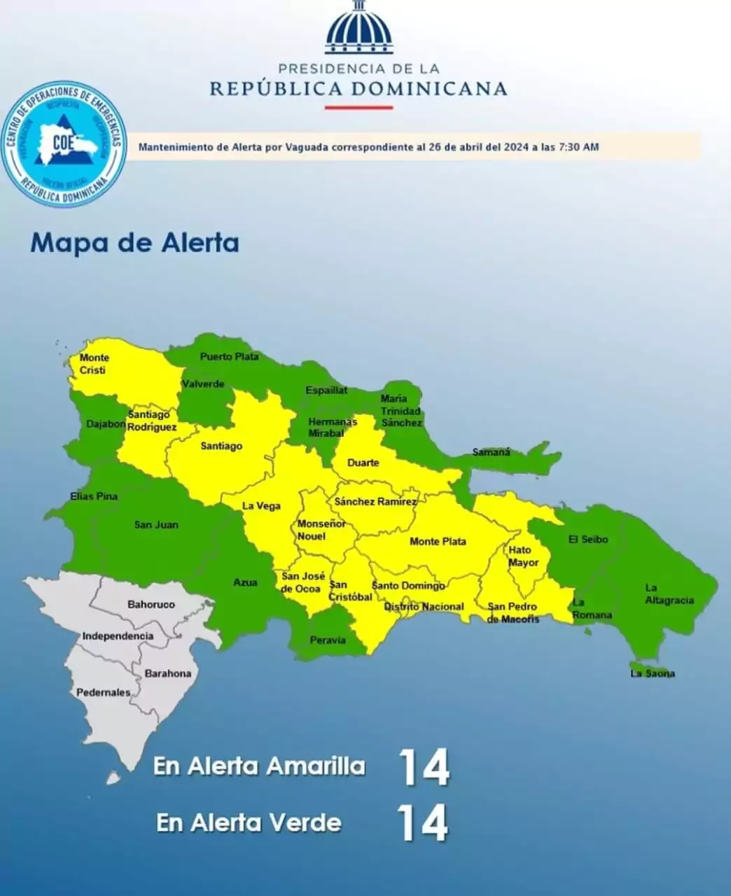 El Centro de Operaciones de Emergencia mantiene 14 provincias en alerta amarilla y 14 en alerta verde, de acuerdo a la última actualización, debido a que se mantendrá la inestabilidad atmosférica por la vaguada que afecta el territorio dominicano, por lo que continuarán los aguaceros de moderados a fuertes en varias provincias del país.