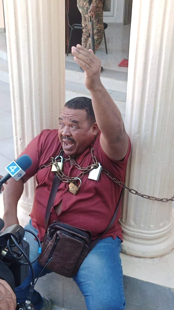 El comerciante Miguel Pérez Fortuna, se encadenó desde tempranas horas de la mañana en frente de la gobernación provincial de Dajabón, exigiendo la devolución de su vehículo y mercancías incautadas, según dijo, por miembros del Cuerpo Especializado en Seguridad Fronteriza Terrestre (Cesfront).
