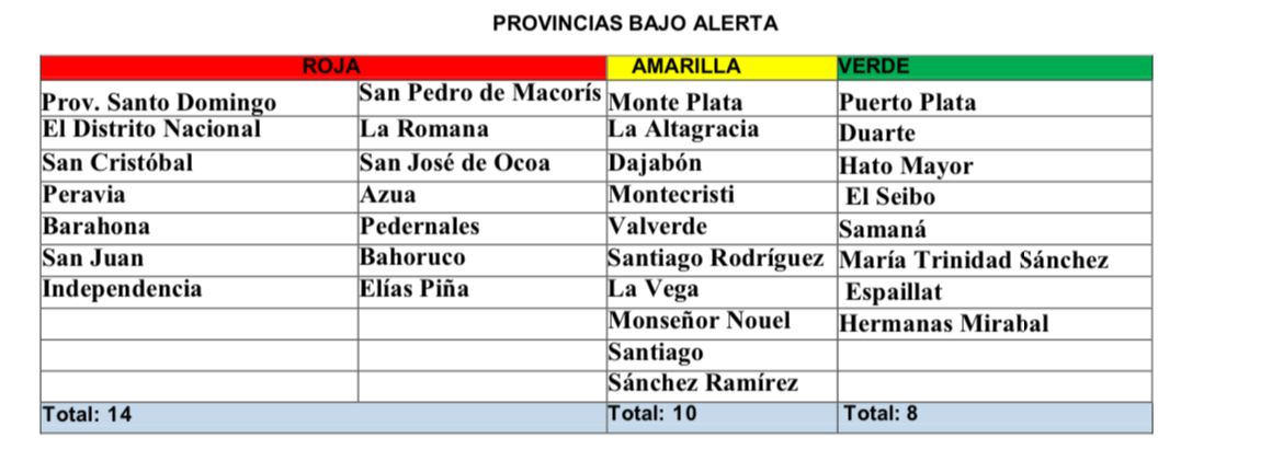 En tal sentido, el COE colocó 14 provincias en alerta roja, 10 en amarilla y ocho en verde.