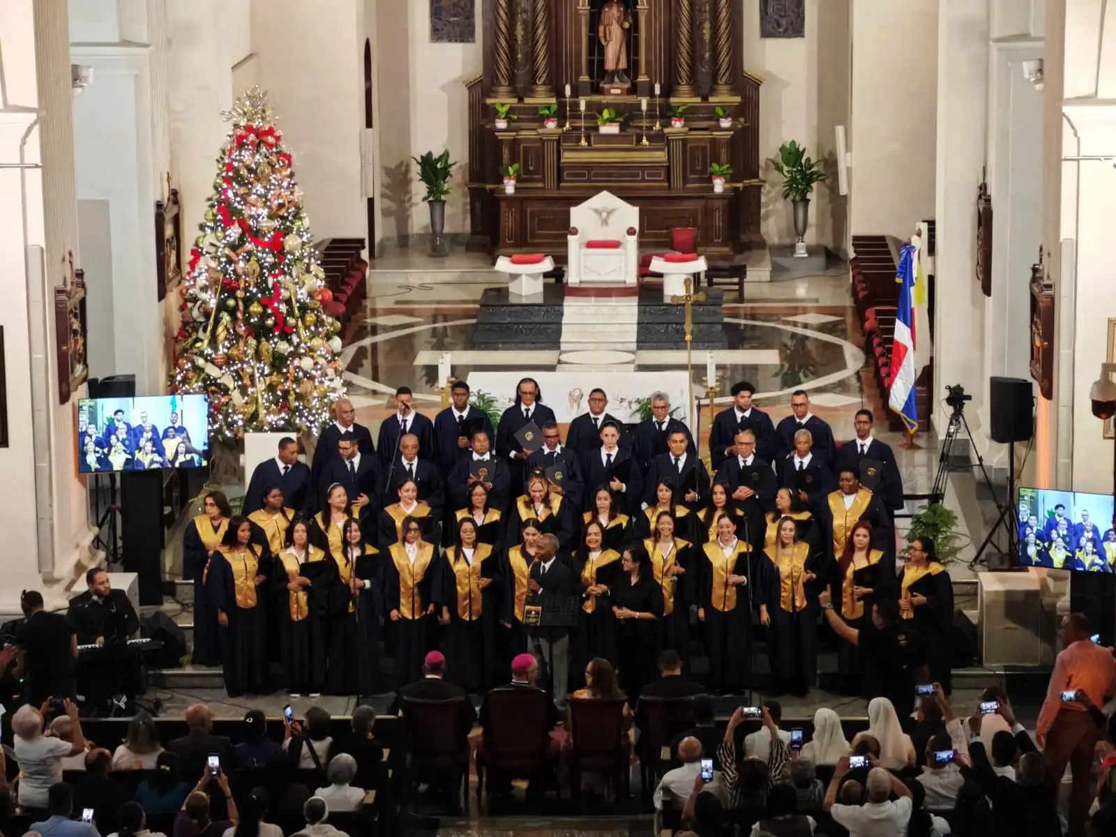 La gobernadora de Santiago, licenciada Rosa Santos; el arzobispo metropolitano, monseñor Héctor Rafael Rodríguez; monseñor Andrés Amauri Rosario, obispo auxiliar de la arquidiócesis; el padre Regino, vicario de la Catedral Santiago Apóstol, junto a otras autoridades eclesiásticas y civiles, fueron testigos, junto al numeroso público que abarrotó la catedral, de esta gala de voces celestiales que enaltecen el canto sacro.