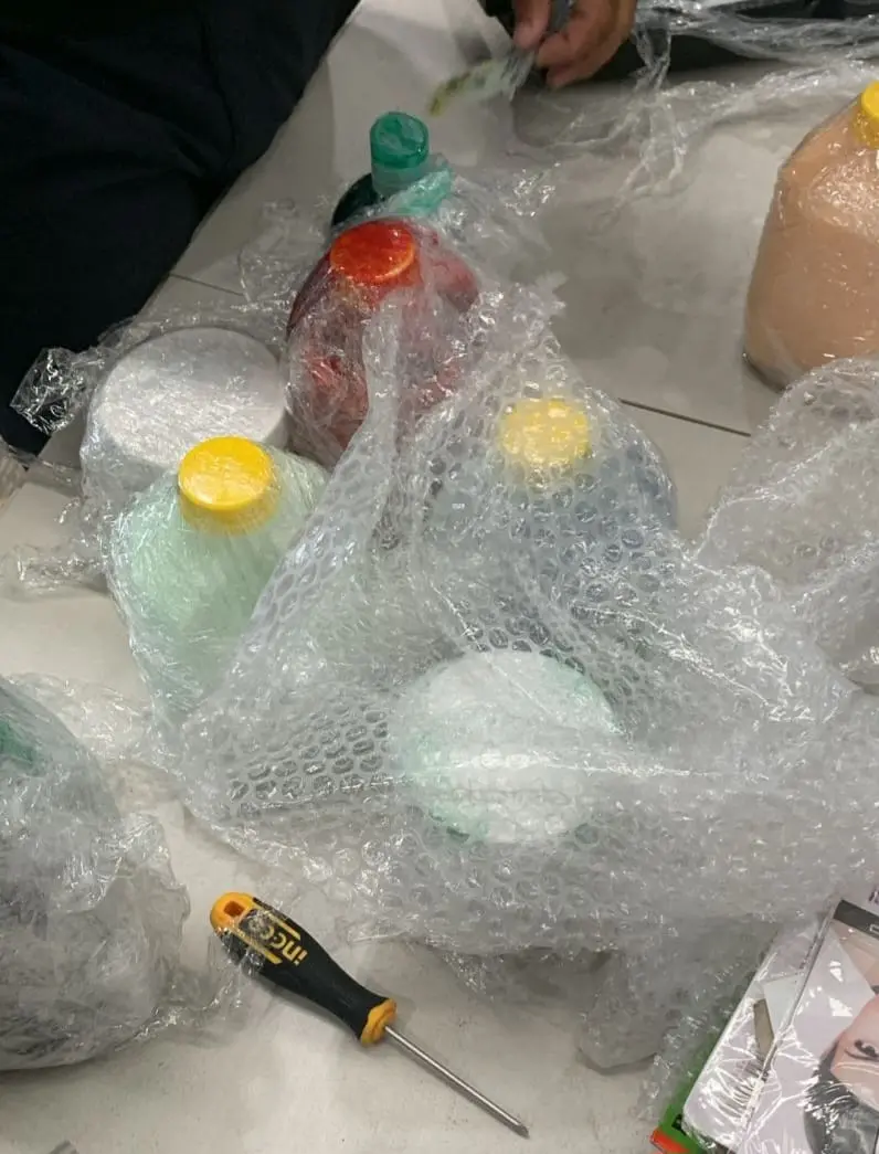 Al iniciar el protocolo, se ocuparon dentro del paquete ocho envases de tratamiento para el pelo y champú llenos de cocaína, los cuales fueron enviados por una mujer