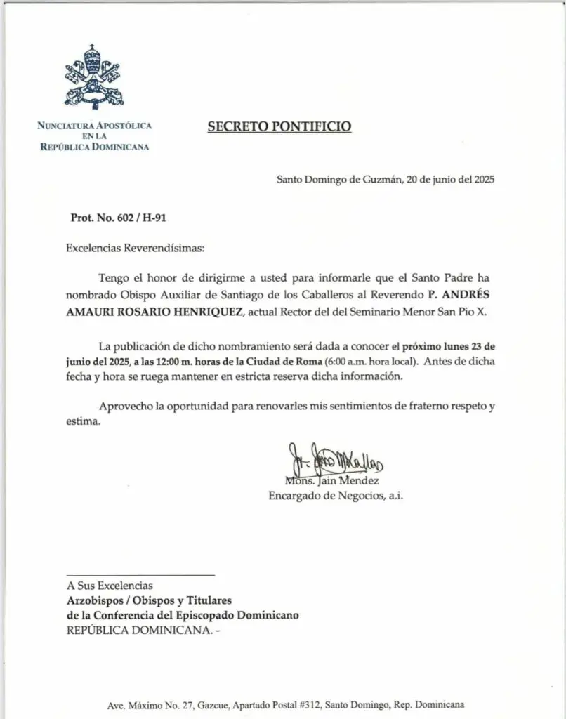 El papa León XIV designó como obispo auxiliar de la Arquidiócesis de Santiago de los Caballeros al padre Andrés Amauri Rosario Henríquez, quien hasta la fecha se desempeñaba como rector del Seminario Menor San Pío X desde el 2020.