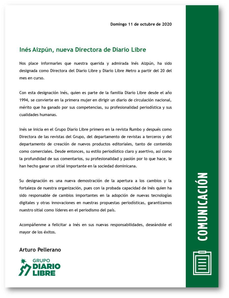 Designan a la periodista Inés Aizpún como nueva directora del Diario Libre y Diario Libre Metro, quien asumirá su cargo a partir del próximo 20 de octubre del año en curso.
