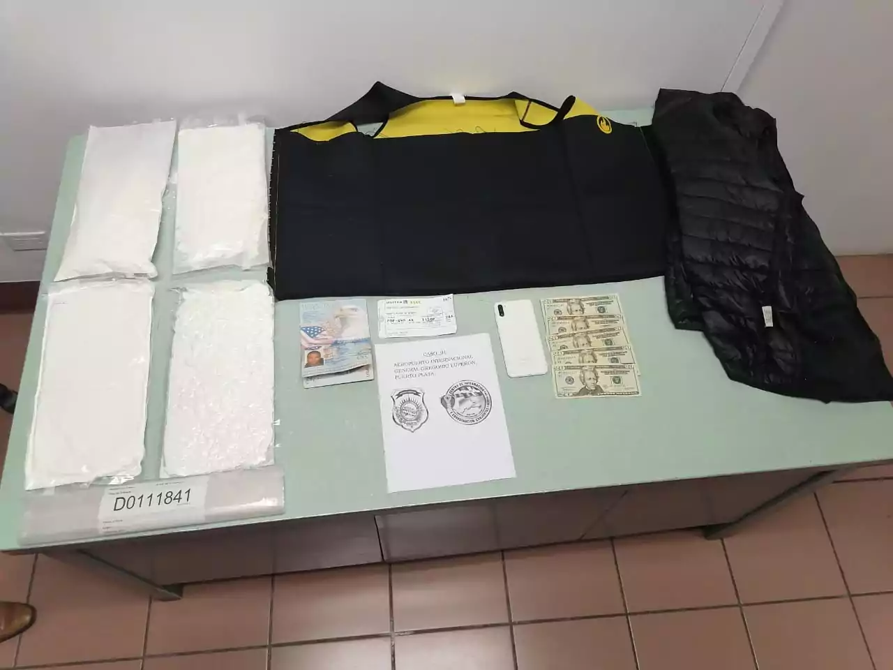 El joven de 30 años fue arrestado antes de abordar un vuelo con destino a Newark, Estados Unidos y al requisar el chaleco que llevaba puesto, se encontraron cuatro láminas presumiblemente cocaína, con un peso preliminar de 3.2 kilogramos.