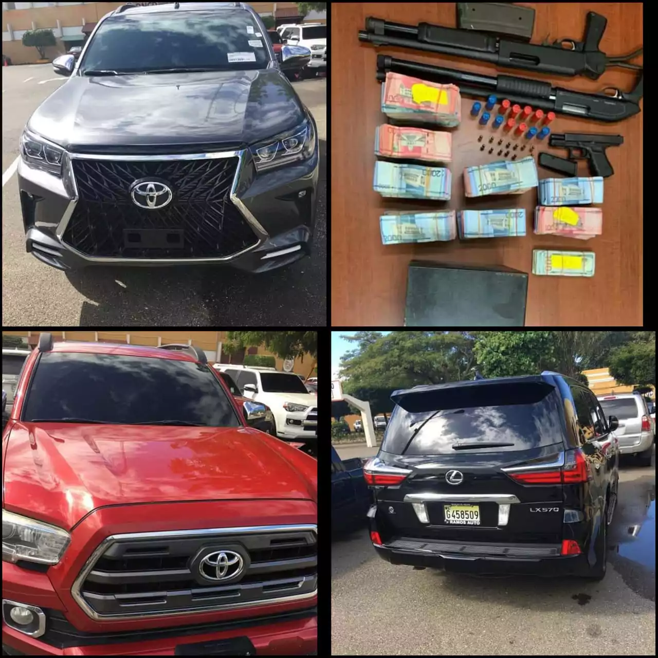 En la requisa domiciliaria también se ocupó una pistola calibre 9mms y dos (2) escopetas cal. 12., tres (3) Jeepetas, entre ellas una marca Toyota Lexus año 2020, una jeepeta marca Toyota Runner, una camioneta marca Toyota Hilux y otra de la marca Nissan; todas de diferentes colores y modelos.