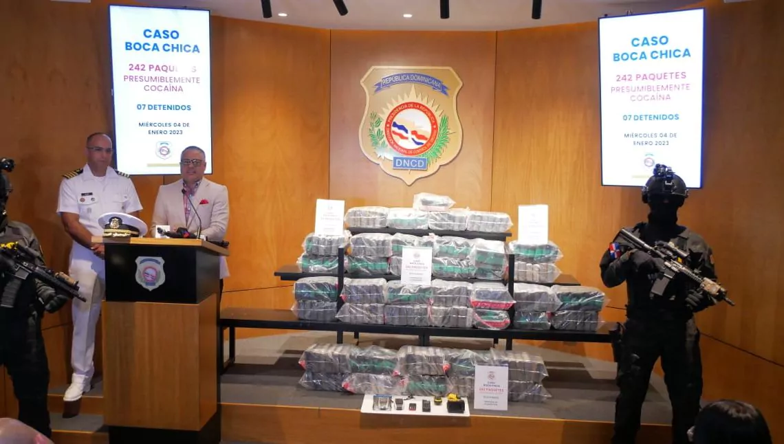 La Dirección Nacional de Control de Drogas (DNCD), informó que, en conjunto con la Armada de República Dominicana y la Fuerza Aérea, coordinados por miembros del Ministerio Público, confiscaron 242 paquetes presumiblemente cocaína, frente a las costas del municipio de Boca Chica, provincia Santo Domingo.