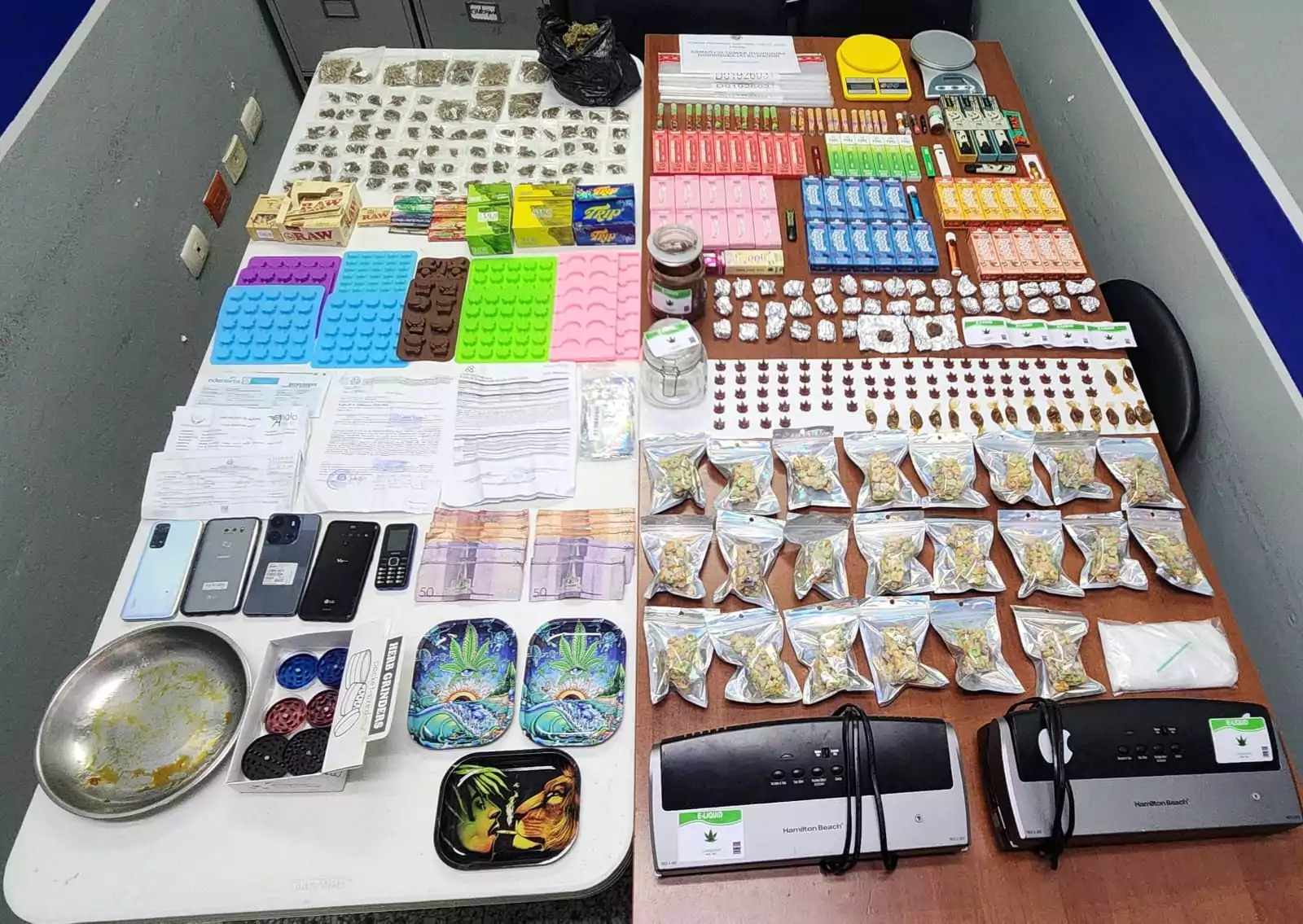 Se confiscaron también 03 trituradoras, 02 máquinas de sellado, bandejas, fundas plásticas (tipo ziploc), 11 moldes de goma, varias etiquetas alusivas a marihuana, 06 celulares, 03 motocicletas, varios documentos y otras evidencias.