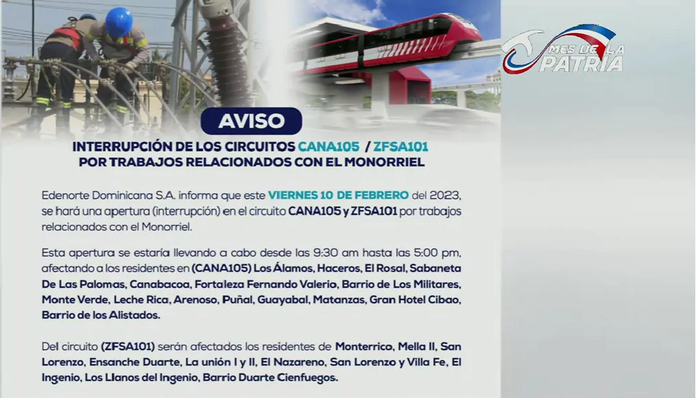 EDENORTE Dominicana informo que desde esta mañana suspensiones del suministro eléctrico en varios sectores del municipio de Santiago. la dirección de comunicación de la empresa informo que la suspensión se debe a los trabajos que se realizan en la construcción del Monorriel.