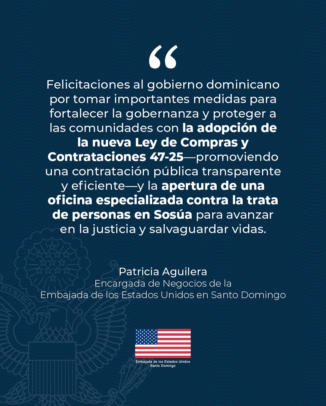 Felicitaciones al gobierno dominicano por tomar importantes medidas para fortalecer la gobernanza y proteger a las comunidades con la adopción de la nueva Ley de Compras y Contrataciones 47-25, promoviendo una contratación pública, transparente y eficiente y, la apertura de una oficina especializada contra la trata de personas en Sosúa para avanzar en la justicia y salvaguardar vidas”, expresó Aguilera.