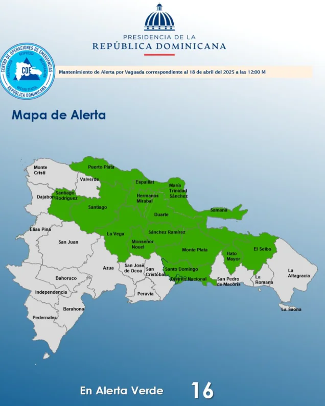 El COE mantiene 15 provincias y el Distrito Nacional en alerta verde, debido a que el informe del INDOMET establece que hoy, Viernes Santo, se han presentado algunas lluvias débiles a localmente moderadas, producto del arrastre que realiza el viento moderado del norte/noreste.