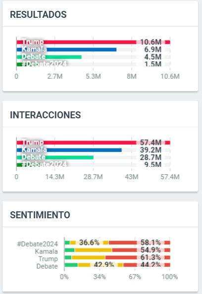 Durante el debate entre Kamala Harris y Donald Trump, basado en los datos visualizados en las imágenes que has proporcionado, se pueden identificar varios puntos clave: