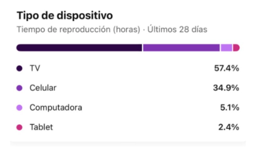 El 57.4% del tiempo de reproducción ocurre en televisores inteligentes, muy por encima del 34.9% que se consume en celulares. Esto revela un hábito claro: se trata de un consumo “de sala”, en familia o con amigos, de sesiones largas y con plena atención, similar al de los noticieros tradicionales.