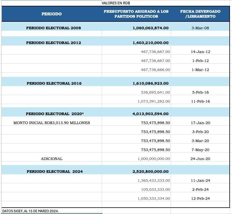 Según la asignación presupuestaria de este año, un total de RD $2,520,800,000.00 se ha destinado para el financiamiento y las actividades de campaña de estas organizaciones políticas.