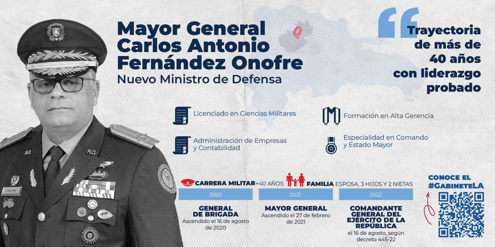 En este decreto, el Mayor General Carlos Antonio Fernández Onofre, ERD, ha sido ascendido al rango de Teniente General, ERD, y designado como nuevo Ministro de Defensa.